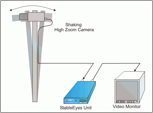 The StableEyes video stabilizer is simply installed in-line with the viewing monitor and is compatible with either live or pre-recorded video. The system operates by employing ultra-fast video motion analysis techniques to remove the shake in real-time, resulting in stable video, which is far easier to view.